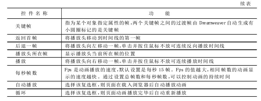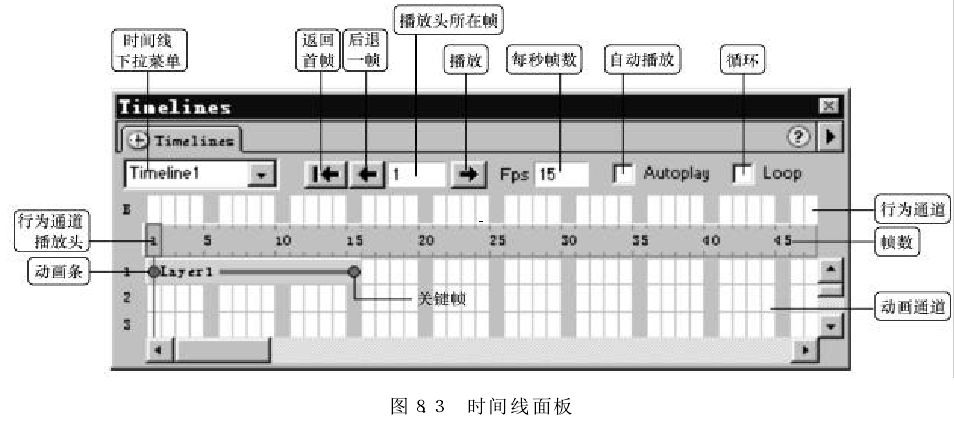 "Timeline(时间线)”面板描绘了层和图像随时间变化的属性。在菜单栏中选择“Window" →"Time lines" 命令可打开时间线面板。时间线面板所包含的控件如图所示。