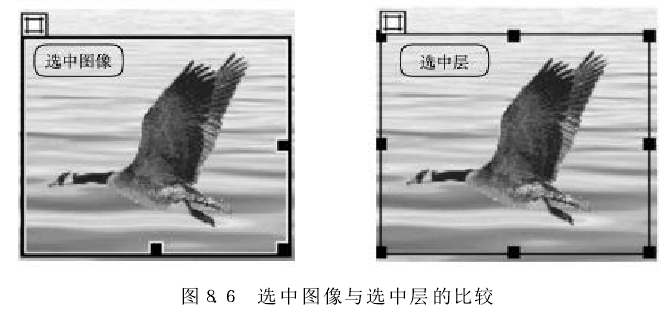 (1) 在选择创建动画层时,选中的不是层,而是把层中的对象(如图像等)选中,这样加到时间线中的对象就不是层,而是层中的对象,这时再移动层自然不会出现层的运动轨迹。正确的方法是一定要选中层,选择图像和选择层的区别如图所示。