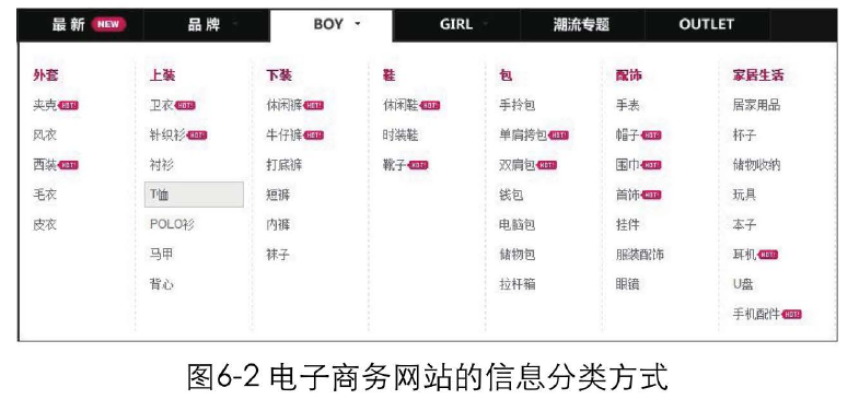 比如,在生活中,要买一件男士T恤,会首先找到商场卖男装的楼层,再找到店铺中摆放上衣的区域去挑选 恤。在电子商务网站对商品进行组织时,同样采用了这种 “男装>上装>T恤" 的分类方式,如图6-2所示。如果分类方式改成 "上装>男装>T恤",你会不会觉得怪怪的呢? 不符合逻辑习惯的分类很容易把用户弄糊涂 。