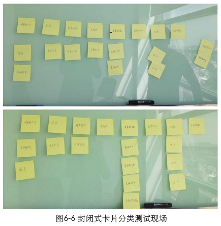 封闭式: 网站制作设计师首先会将导航的架构设计好,确定出导航的个数和名称,再将属于这些类目的卡片分发给用户,让用户根据自己的期望,把卡片归类在不同的导航分类下。如果有些卡片用户不知道该将它分到哪个类目下,可以将它拿出来,所有卡片不一定要全部分完。封闭式的分类更利于掌控,可以用于对信息设计的结果进行验证的阶段,如图6-5.图6-6所示。
