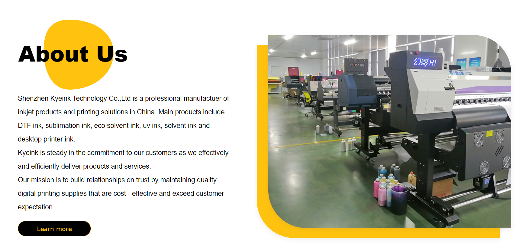 Shenzhen Kyeink Technology Co.,Ltd is a professional manufactuer of inkjet products and printing solutions in China. Main products include DTF ink, sublimation ink, eco solvent ink, uv ink, solvent ink and desktop printer ink.