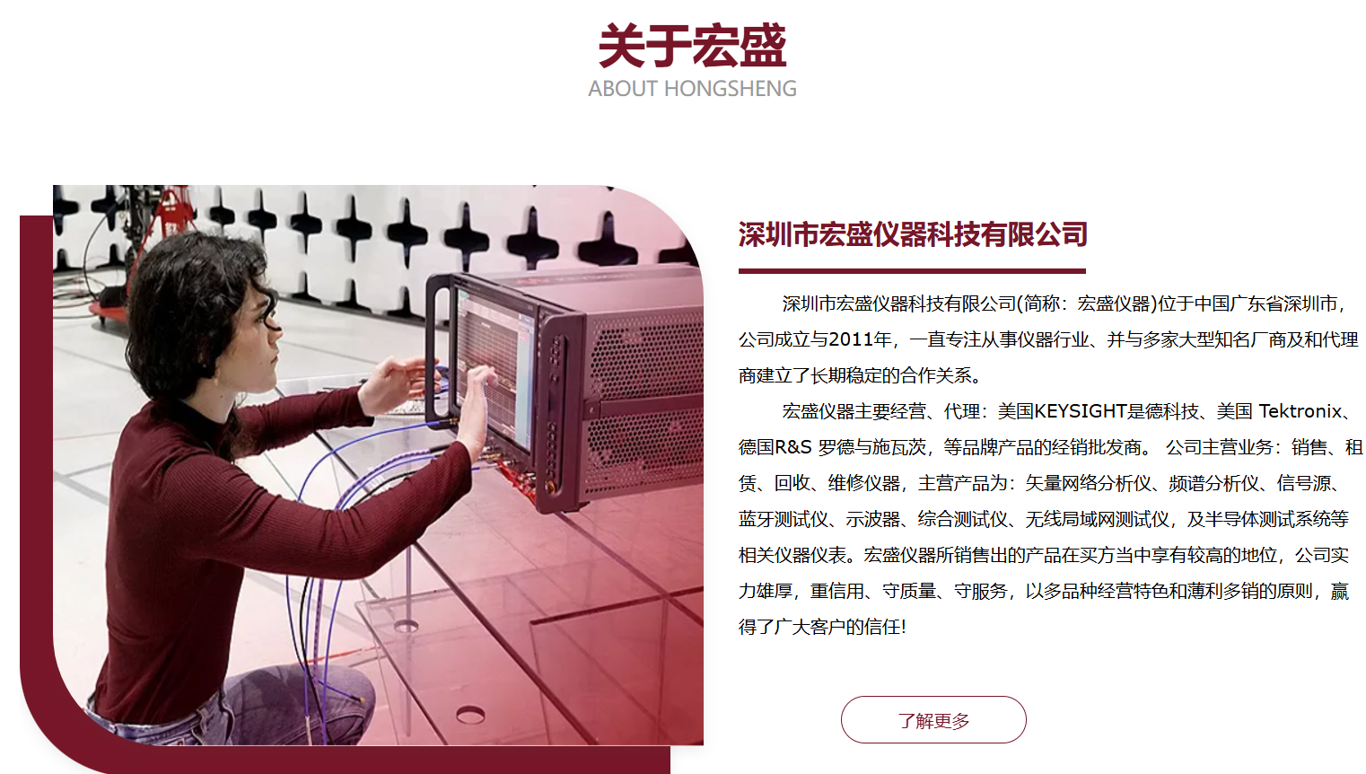深圳市宏盛仪器科技有限公司(简称:宏盛仪器)位于中国广东省深圳市,公司成立与2011年,一直专注从事仪器行业、并与多家大型知名厂商及和代理商建立了长期稳定的合作关系。