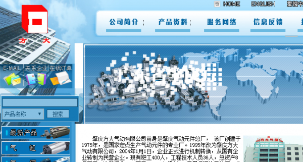 肇庆方大气动有限公司前身是肇庆气动元件总厂, 该厂创建于1975年,是国家定点生产气动元件的专业厂。1995年改为肇庆方大气动有限公司,2004年1月1日,企业正式进行机制转换,从国有企业转制为民营企业。现有职工400人,工程技术人员36人,总资产8仟万元,注册资金5610万元。1999年通过ISO质量保证体系认证,公司主营气缸、气阀、气源三大件及成套设备。产品多次被评为“省优”、“部优”、“名优”产品,其中,“方大”牌气动元件被评为广东省名牌产品。方大公司是全国气动行业中产品品种最齐全、规格最多的气动元件专业生产公司,多年来公司各项主要经济指标在国内气动行业中处于前列,在国内具有重要的影响力。