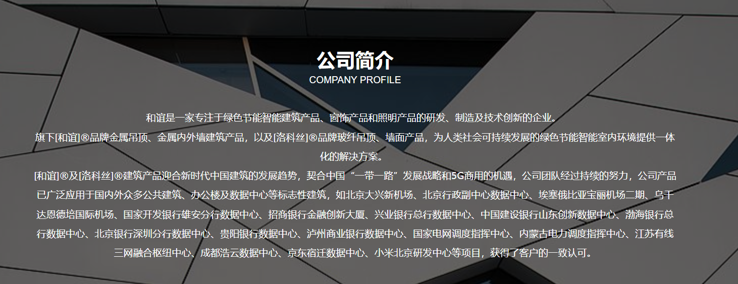 旗下[和谊]®品牌金属吊顶、金属内外墙建筑产品,以及[洛科丝]®品牌玻纤吊顶、墙面产品,为人类社会可持续发展的绿色节能智能室内环境提供一体化的解决方案。