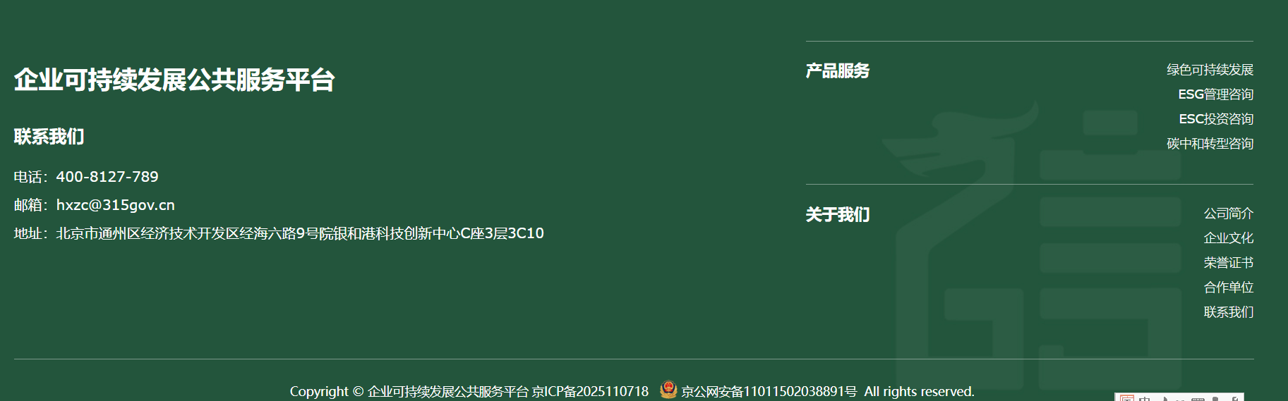 企业可持续发展公共服务平台,隶属于华夏众诚绿金环保咨询(北京)有限公司(简称“华夏众诚绿金”),为华夏众诚集团旗下专业从事绿色可持续发展与ESG管理咨询、ESG投资咨询、碳中和转型咨询等可持续发展领域的服务及工具创新,助力客户绿色低碳转型,促进企业未来可持续发展的服务子公司。