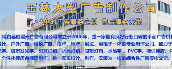 博白县威*天广告有限公司是一家技术先进、实力雄厚,集广告设计、户外广告、楼顶广告、招牌、标牌、展览、展柜于一体的专业制作公司。致力于门头LED发光字、吸塑发光字、超薄灯箱、水晶灯箱、吸塑灯箱、水晶字 、PVC字、标识标牌、户内外广告、个性化挂历台挂历制作。是一家集设计、制作、安装,为一体的综合性广告公司。专业制作数码写真、喷绘、印刷彩业、海报、丝网印、条幅、锦旗、彩旗、绶带、衣服印字、礼品印字、字牌、制度牌、胸牌、标牌、广告牌、楼牌、铜牌、铝牌、门牌号、门头、灯箱、金卡、银卡、贵宾卡、会员卡、胸卡、展板、X展架、易拉宝、钛金字、铁皮字、水晶字、芙蓉字、发光字、LED霓虹灯、显示屏、吸塑、拱门、墙体广告发布、车体广告发布等。 公司拥有大型的喷绘、写真、横幅、刻字、打印等专业广告设备,作业面积达100多平米,交通便利。公司从创立至今,拥有丰富的经验,通过和各界客户的合作,已形成一套自己的运作方式。