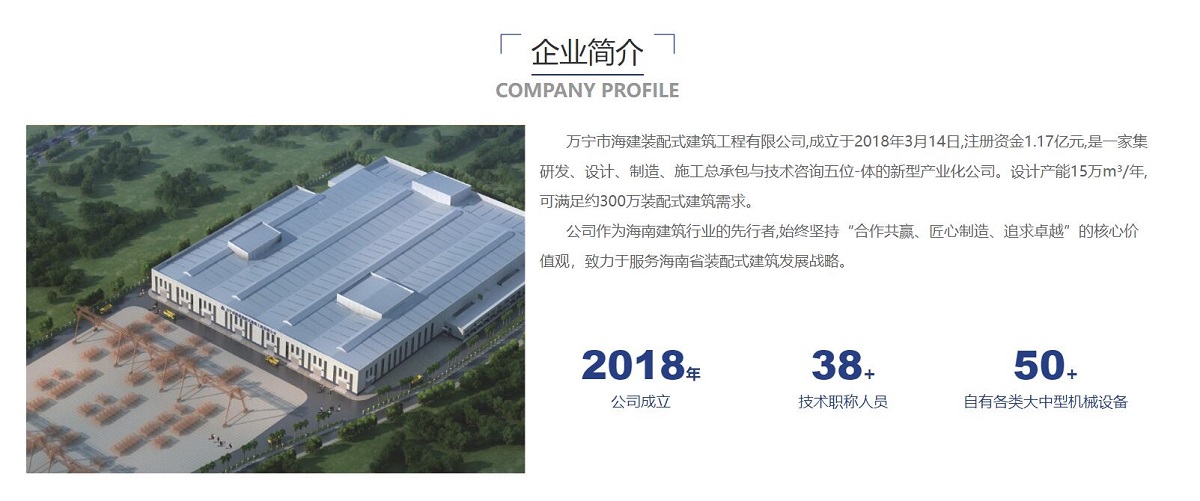 万宁市海建装配式建筑工程有限公司,成立于2018年3月14日,注册资金1.17亿元,是一家集研发、设计、制造、施工总承包与技术咨询五位-体的新型产业化公司。设计产能15万m³/年,可满足约300万装配式建筑需求。