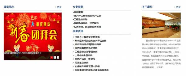 重庆康华所在恪守“独立、客观、公正”的基本原则下,切实履行“诚信、优质、高效”的服务方针,秉承 “服务第一、质量第一、信誉第一”的执业宗旨,坚持“百年老店”的执业理念,一切以客户需求为导向和出发点,利用自身服务能力的优势,在审计、资产评估及工程造价咨询服务领域逐步形成了具有自身特色的个性化服务,主要特征是对客户的需求进行专业分析,结合客户的实际状况,提供资产组合、优化方案,用最优的工作方案实现企业最大价值,用最优的资产组合方式实现客户的经济行为,从而全面提高重庆康华会计师事务所的服务能力,为客户提供最优质的服务。