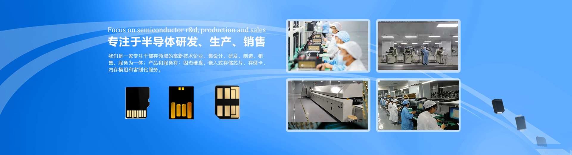 我們是一家专注于储存领域的高新技术企业,集设计、研发、制造、销售、服务为一体;产品和服务有:固态硬盘、嵌入式存储芯片、存储卡、内存模组和客制化服务。生产基地总投资 2 亿元,生产工厂占地 28900 平米,拥有全球领先的 SiP 封装工艺生产设备及测试设备 , 年产能 100KK。