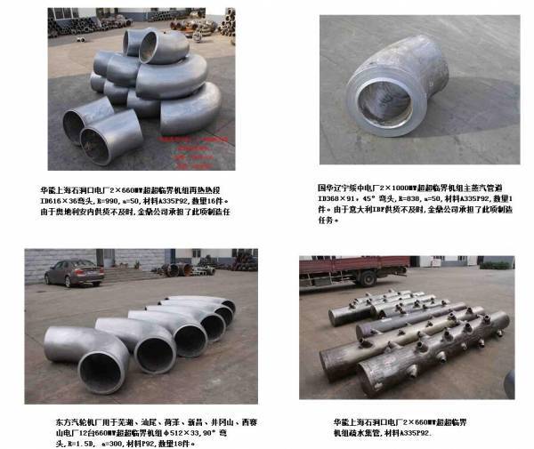天津金*管道有限公司是生产经营工业管道配件及管道系统总承包的综合公司,制造产品主要有高、中、低压三通、弯头、弯管、异径管、封头、接管座、法兰等,拥有大量的配管及管道系统总承包业绩。生产能力强,规格齐全,可满足广大客户需求。本公司多年来与国内行业权威机构合作,共同研究开发了电站管制大口径厚壁三通和中频热推弯头;独创了隧道式热推弯头;A335P91和15NiCuMoNb5-6-4材料管件;钢X70级热压三通; 1000MW超超机组A335P92材料管件;取得了ISO质量、环境认证;OHSAS职业健康安全认证;取得了国家质量监督检验检疫总局颁发的“特种设备压力管道元件制造许可证”; 北京电能产品认证中心PCCC全套超超临界机组产品认证;及多次ASME“PP”认证;承揽了中核秦山二期、中广核多数核电工程非核级管件;近20台超超临界机组全部成套管件;近10台双再热超超临界机组管件;等等高精尖机组的制造任务。二十几年来科研开发与电力机组升级并行,科技成果始终走在同行业前列,各类新产品十余次填补国内空白或超过国际先进水平, 十几次荣获国家重点新产品奖、中国电力科学技术二等奖、天津市科技进步奖。