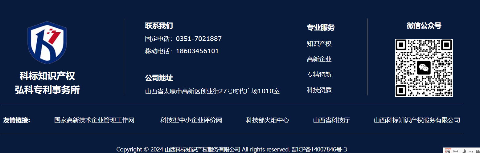 山西科标知识产权服务有限公司成立于2014年,位于太原市高新技术开发区,是山西省综合性知识产权服务机构,下设太原弘科专利代理事务所(机构代码14118)。专业提供高新技术企业认定、专精特新企业认定、专利申请、软著作权登记、商标注册、科技项目申报等一站式服务。公司成立以来,始终坚持诚信负责、专业严谨、优质高效的服务理念,为社会各行业提供富有价值的知识产权保护解决方案。