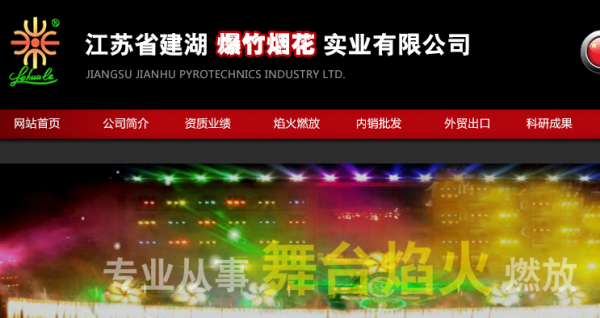 江苏省建湖爆竹烟花实业有限公司由原建湖县花炮工业公司(行政主管部门)和江苏省建湖爆竹烟花实业有限公司合并 改制组建,是一家集烟花爆竹的研发、生产、内销、外贸、燃放于一体的集团公司,拥有2个烟花研发中心、1个综合性进出 口公司和2个境外企业——“中巴合资乐花乐烟火工商有限公司(巴西)”、“江苏建湖烟花(亚美尼亚)有限公司”。公司每年研发烟花新品300多个,年产各类烟花2000多个品种50多万箱,产品远销30多个国家和地区,年出口量30多万箱, 出口产品质量已连续多年名列中国各口岸前茅。大型焰火燃放是公司的品牌业务。公司精心打造了一支具有焰火晚会燃放工程设计与作业资质的专业队伍,装备了 国际上先进的音乐编程无线遥控点火系统。