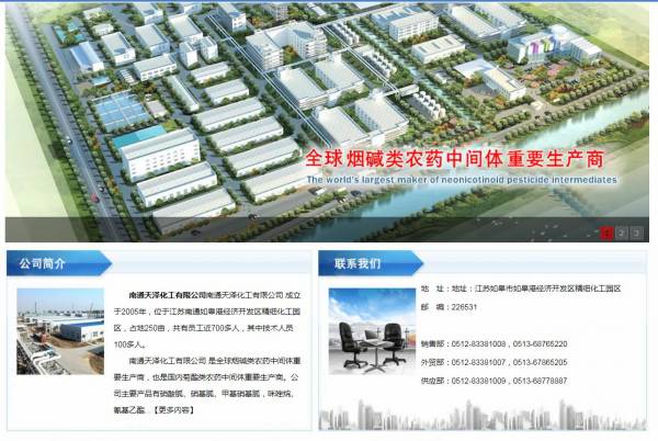 南通*泽化工有限公司 成立于2005年,位于江苏南通如皋港经济开发区精细化工园区,占地250亩,共有员工近750多人,其中技术人员100多人。南通天泽化工有限公司 是全球烟碱类农药中间体重要生产商,也是国内菊酯类农药中间体重要生产商。公司主要强势产品有硝酸胍、硝基胍、甲基硝基胍,咪唑烷、氰基乙酯,以上产品市场占有率达到70%~90%,其它化工产品如3-氰基吡啶、原乙酸三甲酯、贲亭酸甲酯等的产能亦居同行之首。