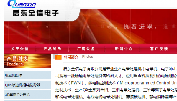 启东**信电子有限公司是专业生产电晕处理机(电晕机、电子冲击机)的企业,公司拥有一批精通电晕处理设备科研人才。应用当今科技前沿的电原理论—谐振式脉宽调制技术(PWN)、微电脑控制技术(Microprogrammed Control Unit)、数字信号控制技术,生产QX全系列单相、三相电晕处理机、三维等离子电晕处理机、塑料杯子和桶电晕处理机、电线电缆电晕处理机、薄膜锁边机、静电消除器等产品,经过众多用户的多年实际使用,确认性能稳定,质量可靠,使用方便,产品在体积,重量,效率,可靠性等方面处于国内外领先水平。