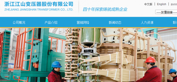 浙江江山变压器股份有限公司(原浙江江山变压器有限公司)始建于1969年,是专业生产500kV级以下电力变压器生产厂家,是国内为数不多的具备500kV级大型变压器生产能力的厂家之一,公司是中国变压器行业协会的理事单位,是2015年全国输配电“十三五”规划的五家起草单位之一,也是浙江省经信委变压器产业技术联盟和浙江省科技厅变压器产业技术创新战略联盟的理事长单位。企业为国家二级企业、浙江省文明单位,是国家经贸委城乡电网改造首批推荐优强企业,被列入国家千家名牌培育工程。公司先后获得国家高新技术企业、省级输变电装备高新技术特色产业基地骨干企业、浙江省名牌产品、浙江省著名商标、浙江省AAA级守合同重信用单位、衢州市政府质量奖、工业龙头企业等荣誉。