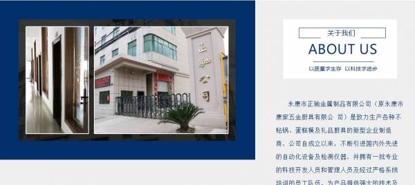 永康市正*金属制品有限公司(原永康市康家五金厨具有限公司)是致力生产各种不粘锅、蛋糕模及礼品厨具的新型企业制造商,公司自成立以来,不断引进国内外先进的自动化设备及检测仪器,并拥有一批专业的科技开发人员和管理人员及经过严格系统培训的员工队伍,为产品提供强大的技术及品质保证,强力打造中国厨具业乃至世界厨具业的高端品牌,现公司产品已远销国外,英国、美国等欧美发达国家地区,并在同一行业中享有较高的声誉。