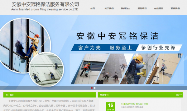 海洋网络从2019年开始与安徽中安冠铭保洁服务有限公司签约网站建设,帮助安徽中安冠铭保洁服务有限公司, 网站设计及开发网站多次网站平台,此项目为安徽中安冠铭保洁服务有限公司新版官方网站。