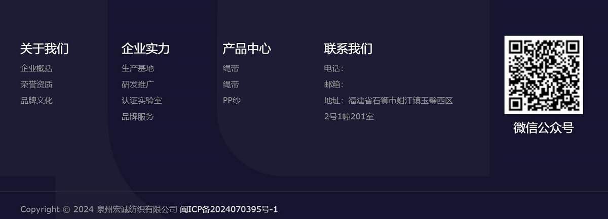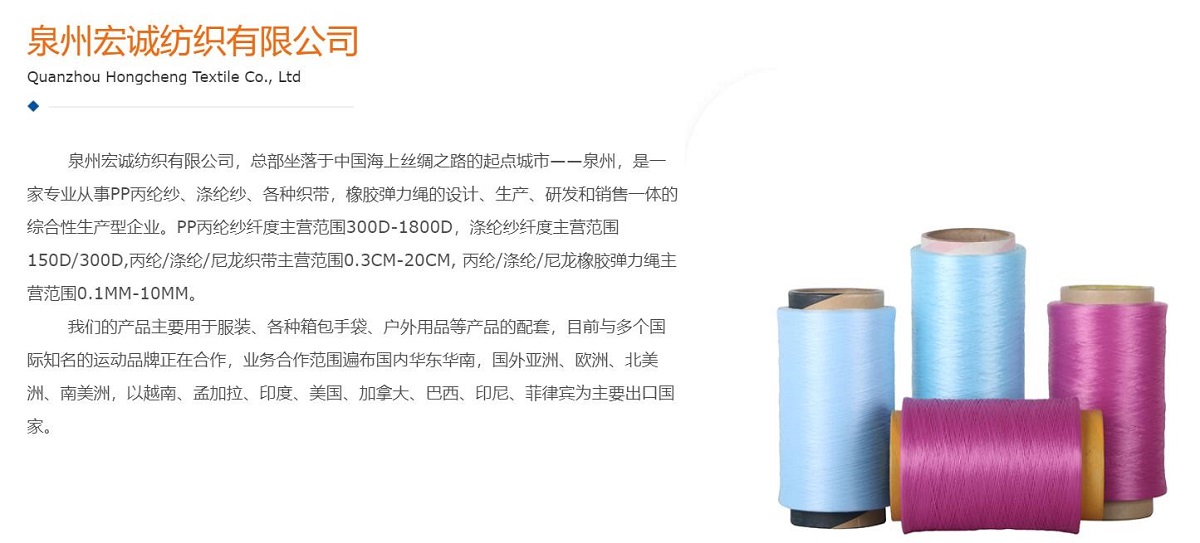 泉州宏诚纺织有限公司,总部坐落于中国海上丝绸之路的起点城市——泉州,是一家专业从事PP丙纶纱、涤纶纱、各种织带,橡胶弹力绳的设计、生产、研发和销售一体的综合性生产型企业。PP丙纶纱纤度主营范围300D-1800D,涤纶纱纤度主营范围150D/300D,丙纶/涤纶/尼龙织带主营范围0.3CM-20CM, 丙纶/涤纶/尼龙橡胶弹力绳主营范围0.1MM-10MM。