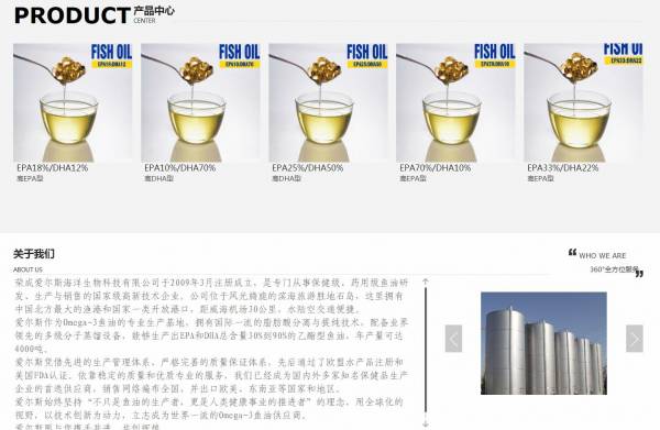 荣成爱*斯海洋生物科技有限公司选用我司企业食品行业的网站优化产品,其SEO关键词有 鱼油,精制鱼油,多烯鱼油,荣成鱼油,山东鱼油。其特点是用很合适的展示方式、展示效果、站点框架,把客户及其用户很关心的问题突出表现;并以简洁明朗的设计风格,清晰展现公司水平实力,确保一秒抓住目标用户眼球,给用户留下良好的第一印象。荣成爱*斯海洋生物科技有限公司成立于2009年,是经荣成市市场监督管理局审核的有资质的公司,其统一社会信用代码:9137108268**437216。公司地址:山东省威海市荣成市石岛工业园龙腾北路109号。