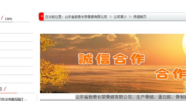 山东省新泰*荣骨碳有限公司选用我司企业宠物用品网站案例,其网站建设的特点是骨碳、蛋白质饲料的加工;蛋白胨、骨粉、磷酸氢钙、骨制脱模剂、饲料油、饲料添加剂的销售。用很合适的展示方式、展示效果、站点框架,把客户及其用户很关心的问题突出表现;并以简洁明朗的设计风格,清晰展现公司水平实力,确保一秒抓住目标用户眼球,给用户留下良好的第一印象。山东省新泰*荣骨碳有限公司成立于2013年,是经新泰市场监督管理局审核的有资质的公司,其统一社会信用代码:913709820**9984010。公司地址:山东省泰安市新泰市岳家庄乡张家村岳石路西北侧。