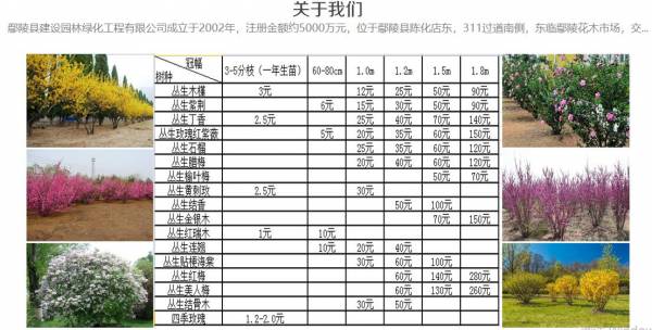 我公司目前是全国**的玫瑰红紫薇种植地之一,公司有苗圃约5000余亩,主要经营丛生、独杆、高杆以及造型玫瑰红紫薇及少量红火箭、红火球紫薇等不同类型及规格的苗木。主要产品有丛生玫瑰红紫薇、丛生石榴、丛生木槿、丛生紫荆、丛生丁香、丛生腊梅、丛生榆叶梅、丛生黄刺玫、丛生结香、丛生金银木、丛生红瑞木、丛生连翘、丛生贴梗海棠、丛生红梅、丛生美人梅、丛生接骨木等花灌木,主要规格为冠幅1.5m、1.8m的工程用苗和苗圃规划用苗。公司还提供2018年丛生类花灌木的较新价格。