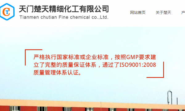 天门楚天精细化工有限公司位于湖北省江汉平原,创始于1997年,其前身为仙桃市楚天精细化工厂,是一家专业从事医药中间体研发、生产、销售一体的医药化工企业。2011年,作为天门市招商引资重点企业进驻岳口工业园,经过几年的开拓与发展,公司生产规模不断扩大,综合实力不断增强。公司主要产品:2-氯-1,4萘醌、4(4-氯苯基)环已烷甲酸、2,7-二氯芴、2-乙基-1,3-环戊二酮、2-甲基-1,3-环戊二酮、6-甲氧基-1奈满酮等。其中2-氯-1,4萘醌和4(4-氯苯基)环已烷基-1-甲酸为生产阿托伐醌的两个重要中间体,阿托伐醌系世卫组织指定治疗爱滋病药物。2,7-二氯芴为抗疟疾药物苯芴醇的重要中间体。产品凭借高技术、高质量销往国内外大、中型制药企业及世卫组织等,享有很高声誉。公司中、高级技术人员占20%,具备年生产能力:2-氯-1,4-萘醌100吨,4-(4-氯苯基)环已烷基-1-甲酸50吨,2,7-二氯芴200吨,D环系列产品45吨。公司产品严格执行国家标准或企业标准,按照GMP要求建立了完整的质量保证体系。通过了ISO9001:2008质量管理体系认证,2-氯-1,4-萘醌,4-(4-氯苯基)环已烷基-1-甲酸通过了欧盟审计。