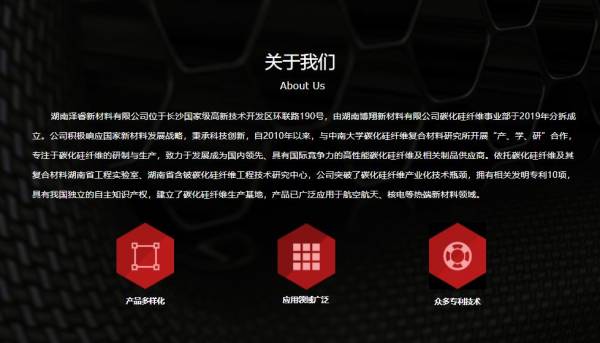 湖南泽睿新材料有限公司位于长沙国家级高新技术开发区环联路190号,由湖南博翔新材料有限公司碳化硅纤维事业部于2019年分拆成立。公司积极响应国家新材料发展战略,秉承科技创新,自2010年以来,与中南大学碳化硅纤维复合材料研究所开展“产、学、研”合作,专注于碳化硅纤维的研制与生产,致力于发展成为国内领先、具有国际竞争力的高性能碳化硅纤维及相关制品供应商。依托碳化硅纤维及其复合材料湖南省工程实验室、湖南省含铍碳化硅纤维工程技术研究中心,公司突破了碳化硅纤维产业化技术瓶颈,拥有相关发明专利10项,具有我国独立的自主知识产权,建立了碳化硅纤维生产基地,产品已广泛应用于航空航天、核电等热端新材料领域。