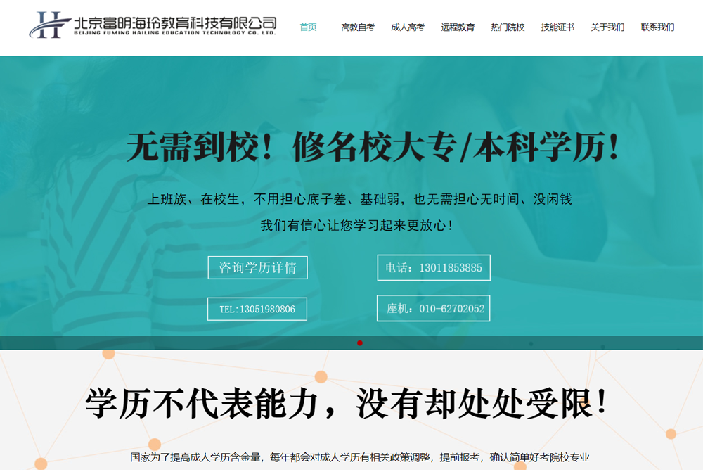 北京富明海玲教育科技有限公司,是一家致力于学历教育、职业教育两大领域的“教育+互联网”公司。我们致力于提供快乐、高效、有价值的 课程体验,让学习像呼吸一样自然,课程推出至今,一直着重打造质量与口碑,积极加强师资队伍建设完善学员 服务的渠道,努力为学员提供最便利的学习体验,坚持技术创新与理念创新并举、学历教育与职业教育互融、线上学习与线下学习互补、国内教育与国际教育并行,在“教育+互联网”的创新驱动下,以教育为本,发挥“创新、激情、关爱、共赢”的核心价值观,感怀终生学习与教育精神,不断完善互联网技术应用服务,全方位构建以学历教育、职业教育为一体的教育生态体系,为成为一家值得信赖的知名教育企业继续砥砺前行。