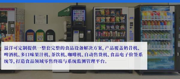 溢洋可定制提供一整套完整的食品设备解决方案,产品覆盖奶昔机、啤酒机、多口味果汁机、茶饮机、咖啡机、自动售货机、食品电子价签系统等,打造食品领域零售终端与系统监测管理平台。